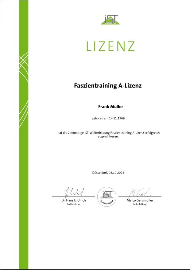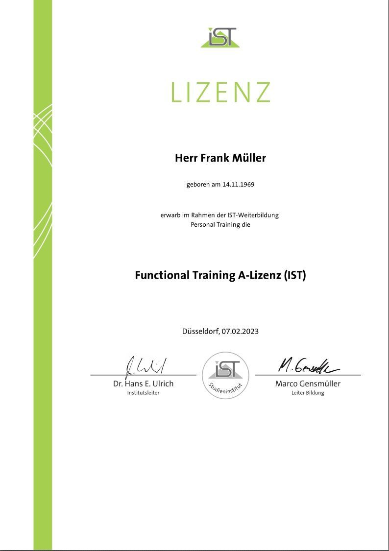 Um diese Fehler nicht noch einmal zu machen und meine Ziele auch erreichen zu können, absolvierte ich am IST die Prüfung zum Fitnesstrainer. Mit den Grundlagen in Anatomie, Ernährung und Trainingswissen ging es direkt weiter in den Studiengang zum Personal Trainer. Mit Widerstands- und funktionellen Trainings in Verbindung mit Beratung zu Gesundheit und Ernährung, biete ich dir nun das Rundum -Paket für deinen Schritt zu mehr Lebensqualität.