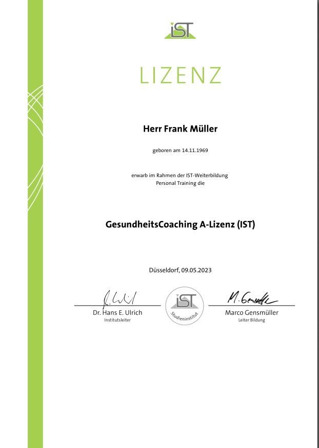 Um diese Fehler nicht noch einmal zu machen und meine Ziele auch erreichen zu können, absolvierte ich am IST die Prüfung zum Fitnesstrainer. Mit den Grundlagen in Anatomie, Ernährung und Trainingswissen ging es direkt weiter in den Studiengang zum Personal Trainer. Mit Widerstands- und funktionellen Trainings in Verbindung mit Beratung zu Gesundheit und Ernährung, biete ich dir nun das Rundum -Paket für deinen Schritt zu mehr Lebensqualität.